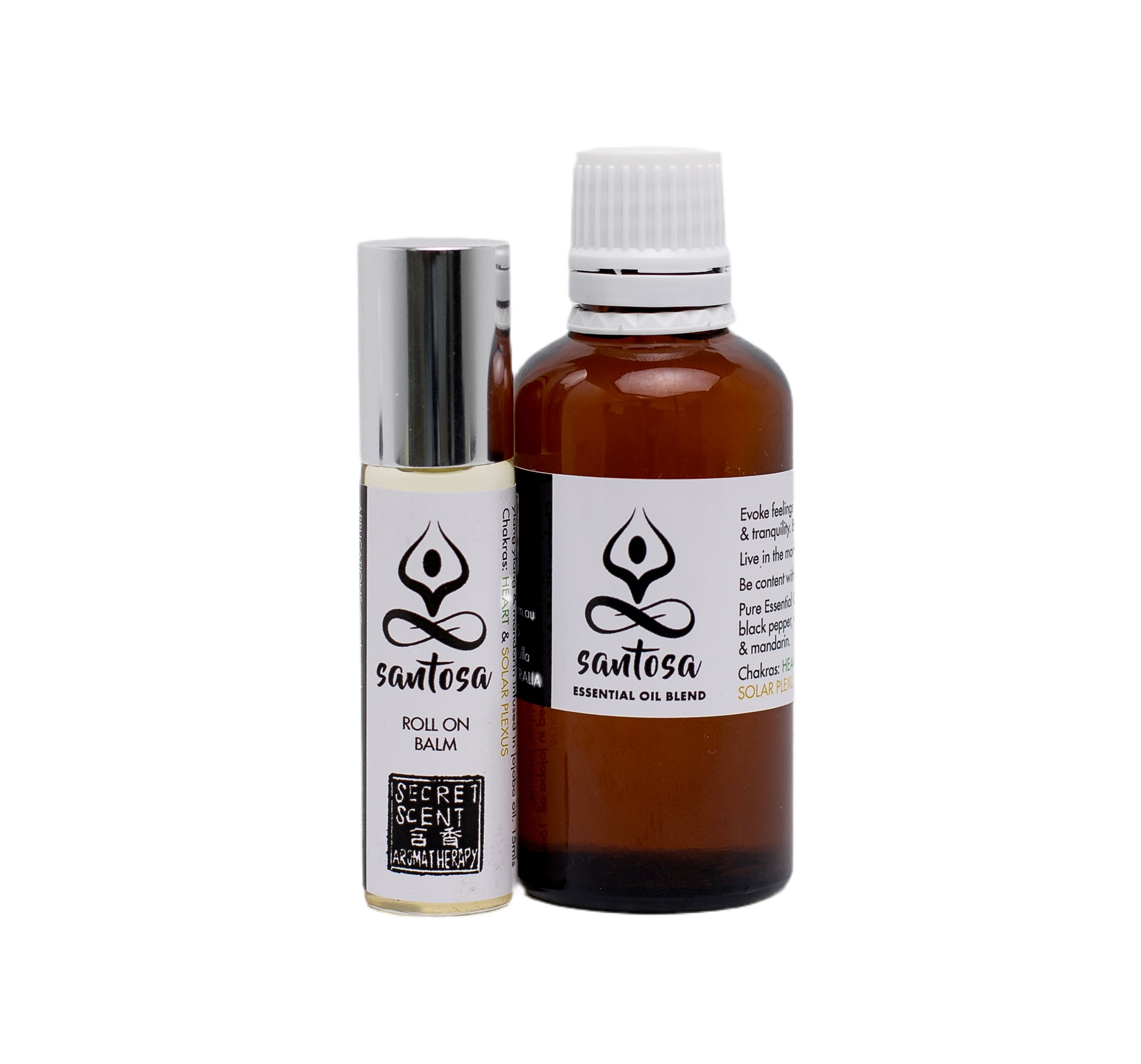The Santosa blend helps you to live in the moment, enjoy life, be content with what is, and evoke feelings of peace and tranquility. Also comes in a roll on balm, and an essential oil blend.